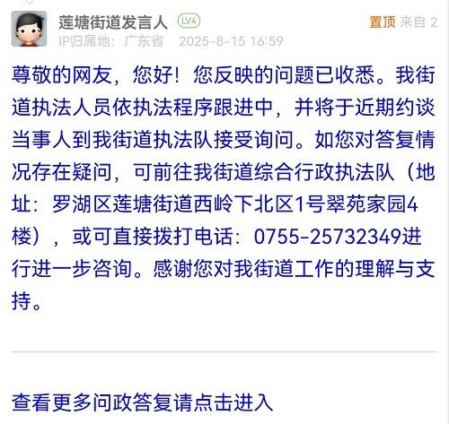 尊敬的網(wǎng)友,您好!您反映的問題已收悉。我街道執(zhí)法人員依執(zhí)法程序跟進(jìn)中,并將于近期約談當(dāng)事人到我街道執(zhí)法隊接受詢問。如您對答復(fù)情況存在疑問,可前往我街道綜合行政執(zhí)法隊(地址:羅湖區(qū)蓮塘街道西嶺下北區(qū)1號翠苑家園4樓),或可直接撥打電話:0755-25732349進(jìn)行進(jìn)一步咨詢。感謝您對我街道工作的理解與支持。