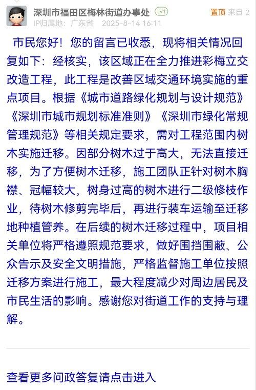 市民您好!您的留言已收悉,現(xiàn)將相關(guān)情況回復(fù)如下:經(jīng)核實(shí),該區(qū)域正在全力推進(jìn)彩梅立交改造工程,此工程是改善區(qū)域交通環(huán)境實(shí)施的重點(diǎn)項目。根據(jù)《城市道路綠化規(guī)劃與設(shè)計規(guī)范》《深圳市城市規(guī)劃標(biāo)準(zhǔn)準(zhǔn)則》《深圳市綠化常規(guī)管理規(guī)范》等相關(guān)規(guī)定要求,需對工程范圍內(nèi)樹木實(shí)施遷移。因部分樹木過于高大,無法直接遷移,為了方便樹木遷移,施工團(tuán)隊正針對樹木胸襟、冠幅較大,樹身過高的樹木進(jìn)行二級修枝作業(yè),待樹木修剪完畢后,再進(jìn)行裝車運(yùn)輸至遷移地種植管養(yǎng)。在后續(xù)的樹木遷移過程中,項目相關(guān)單位將嚴(yán)格遵照規(guī)范要求,做好圍擋圍蔽、公眾告示及安全文明措施,嚴(yán)格監(jiān)督施工單位按照遷移方案進(jìn)行施工,最大程度減少對周邊居民及市民生活的影響。感謝您對街道工作的支持與理解。