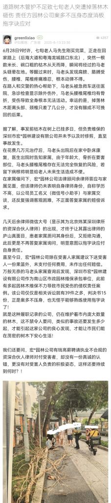 11. 帖文《道路樹木管護(hù)不足致七旬老人突遭掉落林木砸傷 責(zé)任方園林公司案多不壓身態(tài)度消極拖字訣應(yīng)對》